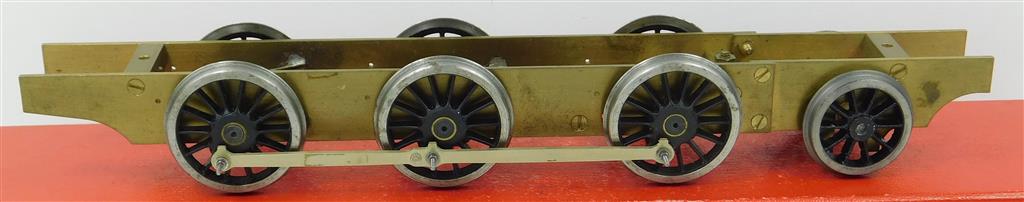 0 scale brass 0-6-2 rolling chassis with Slater's wheels, type unknown, driving wheelbase 51mm+56mm+47mm, 32mm diameter driving Slater's wheels with complete crankpins and con-rods, 25mm diameter pony wheels, 238mm long