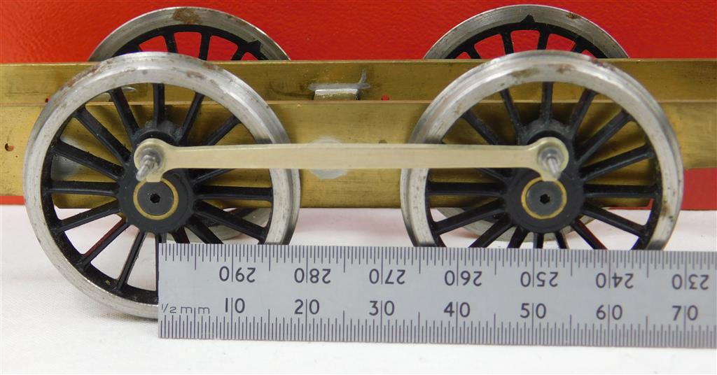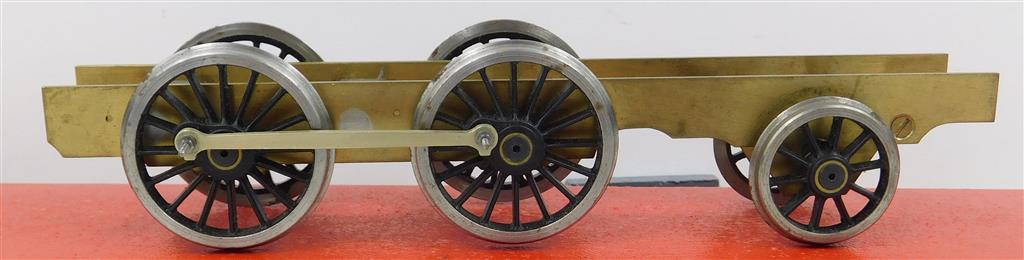 0 scale brass 0-4-2 rolling chassis with Slater's wheels, type unknown, driving wheelbase 51mm+57mm, 36mm diameter driving Slater's wheels with complete crankpins and con-rods, 25mm diameter pony wheels, 174mm long