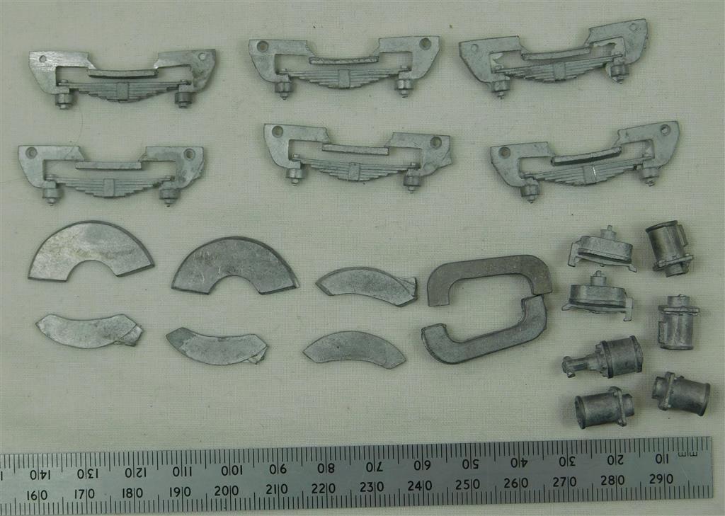 British 0 Gauge : Selection of 0 scale white metal loco wheel balance weights and other parts, type unknown