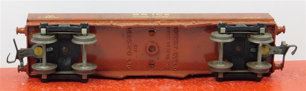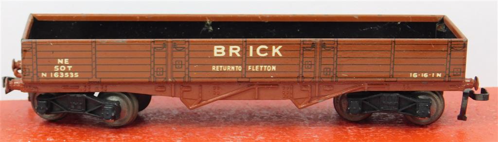 A Hornby Dublo 3 rail bogie brick wagon numbered N163535, brown undertruss, uninsulated metal wheels fitted, in good used condition but needs a clean, supplied in the original box
