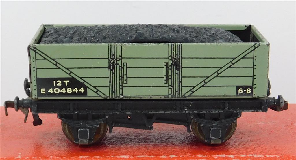 A Hornby Dublo 3 rail tinplate BR open wagon numbered M404844 with load, uninsulated metal wheels fitted, in good used condition, no original box