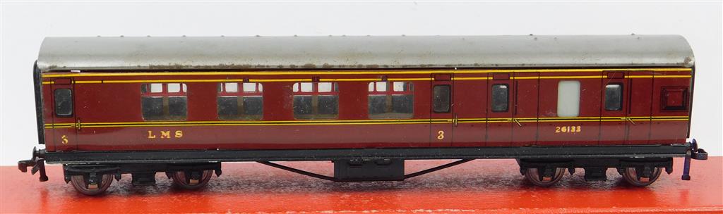 A Hornby Dublo 3 rail tinplate LMS Stanier brake coach numbered 26133, uninsulated metal wheels fitted, in good used condition, needs a clean, supplied in the original box