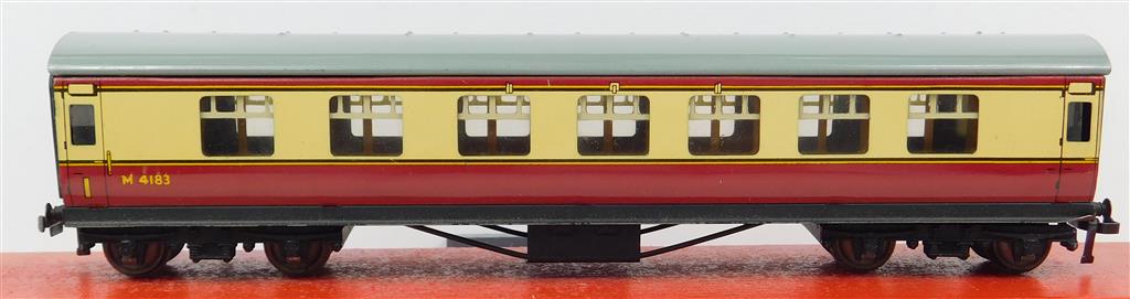 A Hornby Dublo 3 rail tinplate BR Stanier composite coach numbered M4183, uninsulated metal wheels fitted, in good used condition, needs a clean, supplied in the original box