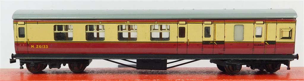 A Hornby Dublo 3 rail tinplate BR Stanier brake coach numbered M26133, uninsulated metal wheels fitted, in good used condition, needs a clean, no original box
