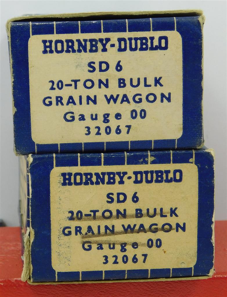 2 Hornby Dublo 2 or 3 rail plastic bodied grain wagons, plastic wheels fitted, in fair condition, supplied in the original boxes