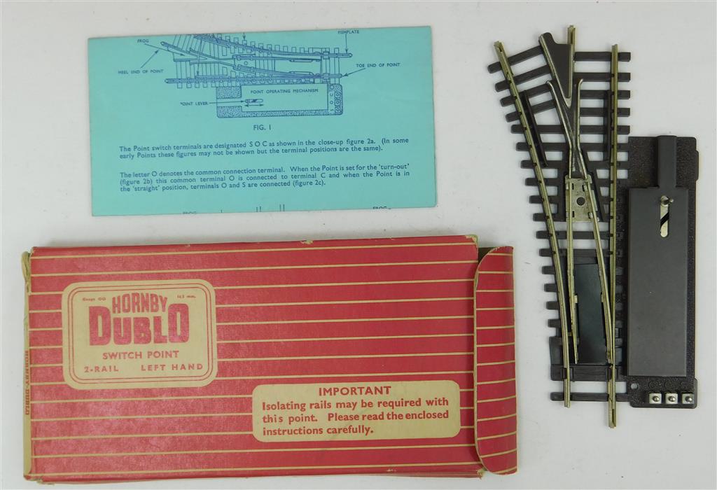 A Hornby Dublo 2 rail left hand electrofrog switch point, with instructions but no isolating rail, in good used condition, supplied in the original box