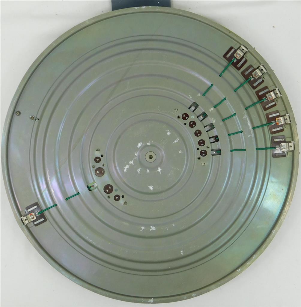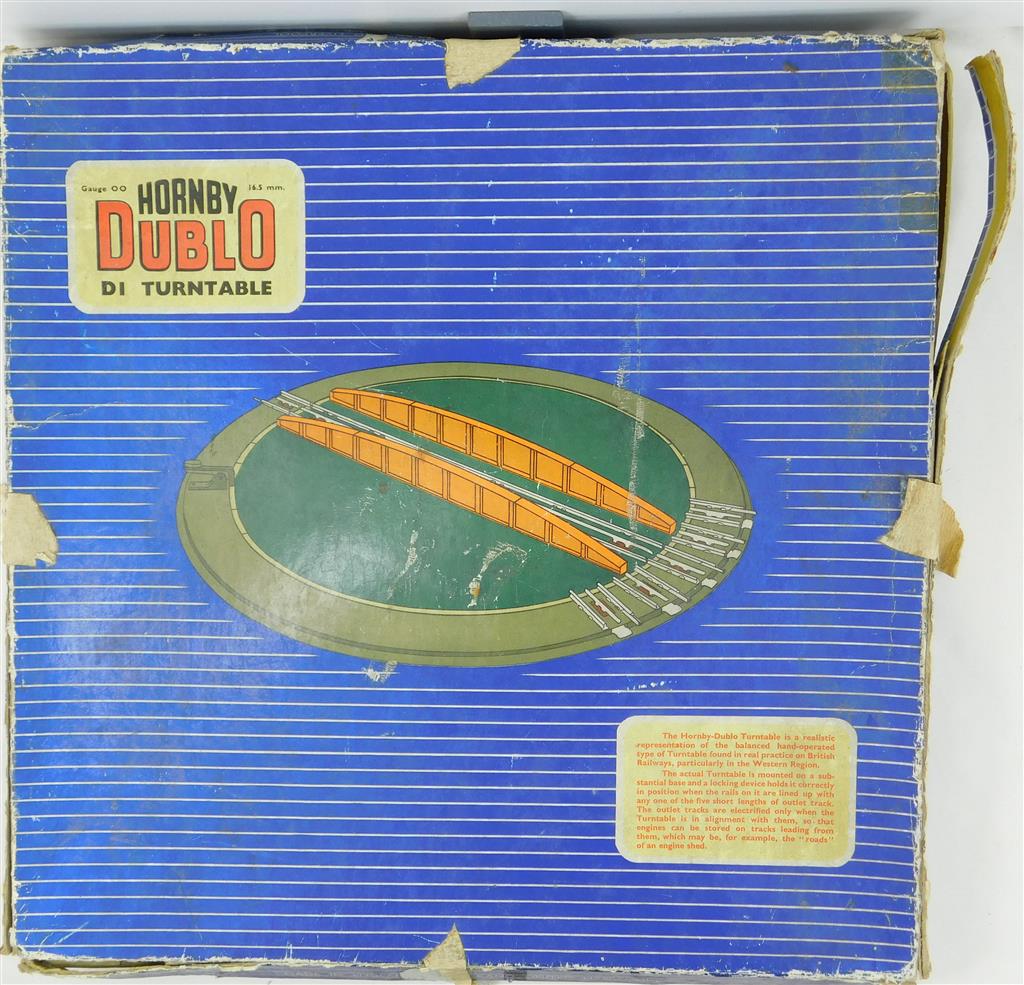 A Hornby Dublo 3 rail tinplate turntable, stiff and would benefit from a little adjustment to be flat and turn easily otherwise in good used condition, needs a clean, tatty original box with instructions