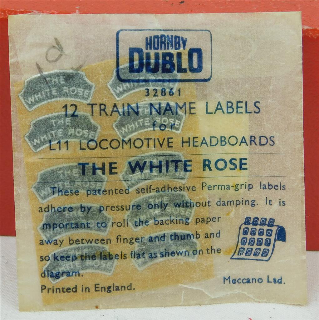 10 Hornby Dublo "The White Rose" headboard labels, in good used condition, supplied in the original packaging