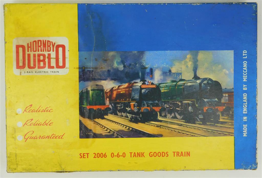 A Hornby Dublo 2006 2 rail set with green R1 0-6-0T steam loco with 3 wagons, good runner, no track, in good used condition, supplied with the original box