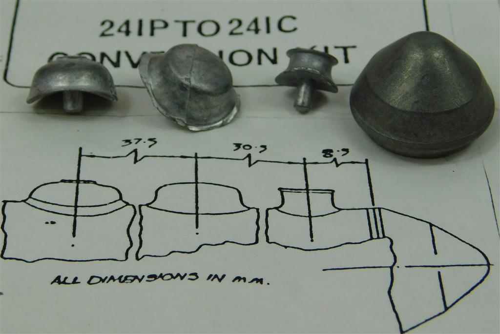White metal castings for converting an SNCF 241P to a 241C: smokebox door cone, two domes and a chimney