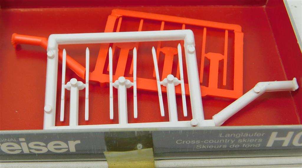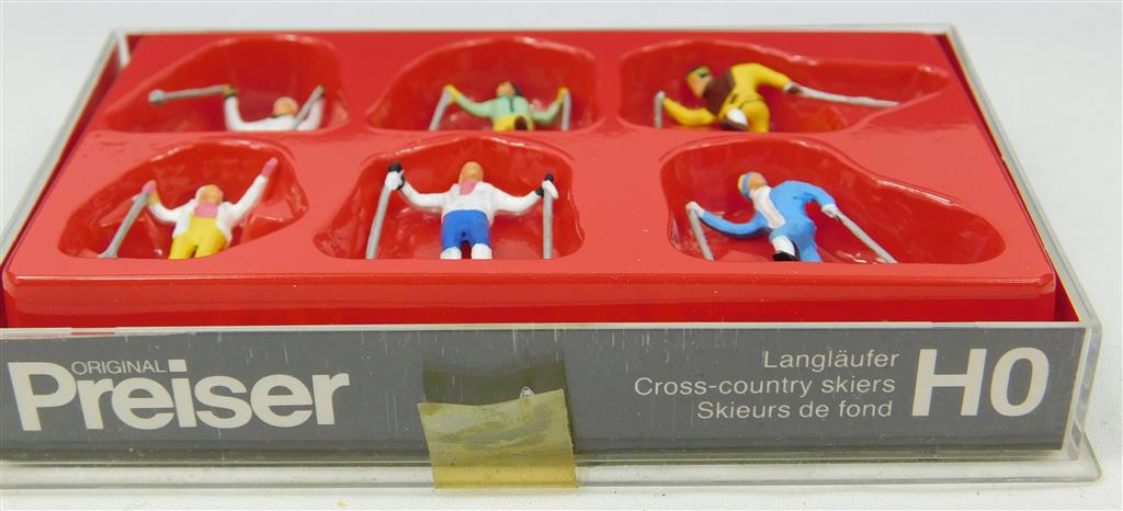 A Preiser H0 scale 10312 Cross-Country Skiers, skis still on the sprues, in very good condition, supplied in the original box
