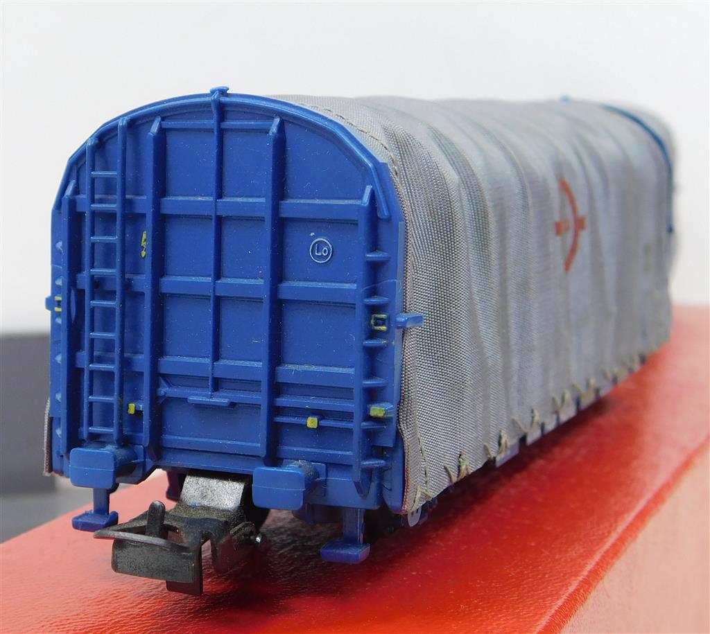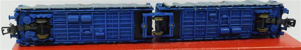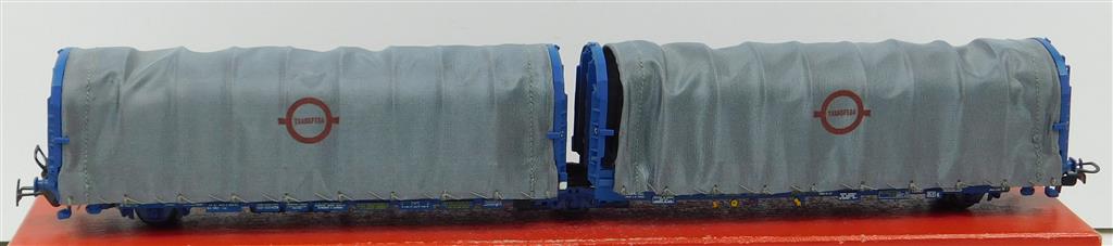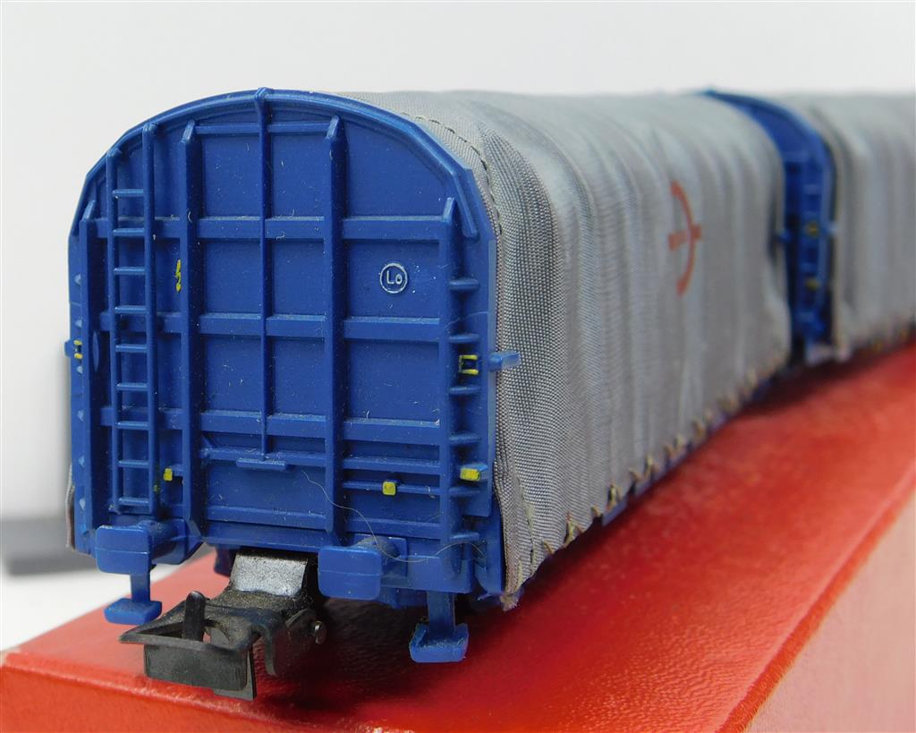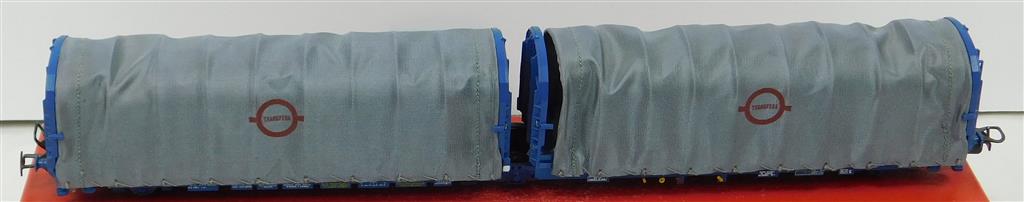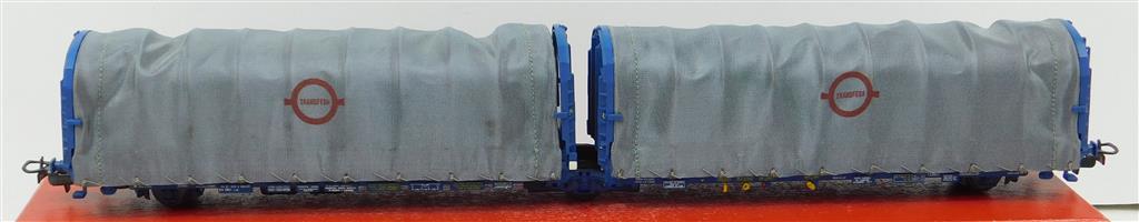 An Electrotren 6100 French Transfesa tarpaulin cover wagon pair, in good condition, one tarpaulin doesn't close properly, supplied in the original box. Metal wheels fitted, pivoted continental couplings.