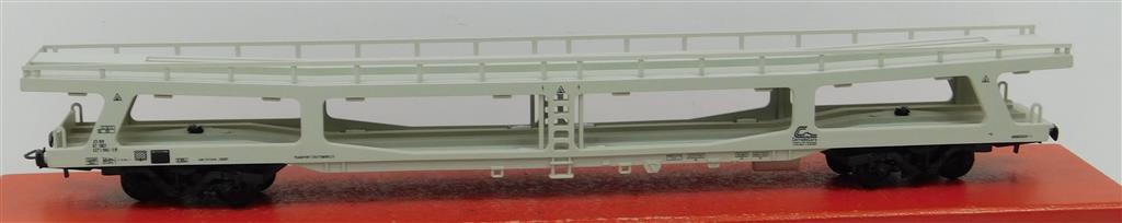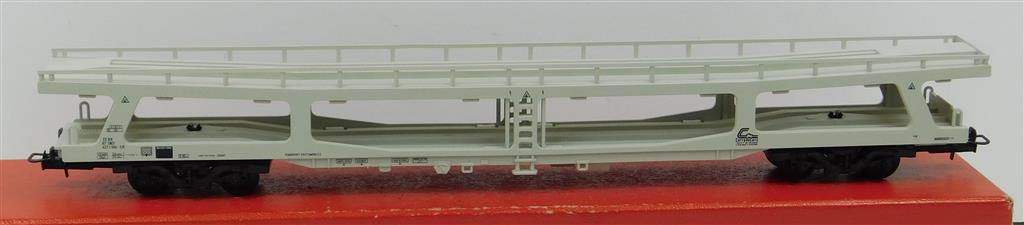 A Lima HL6046 French SNCF bogie car transporter, in good clean condition, supplied in the original box. Metal wheels, pivoted couplings. Previous owner was a smoker.