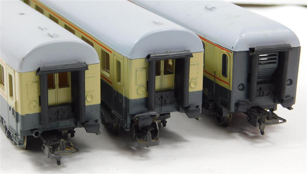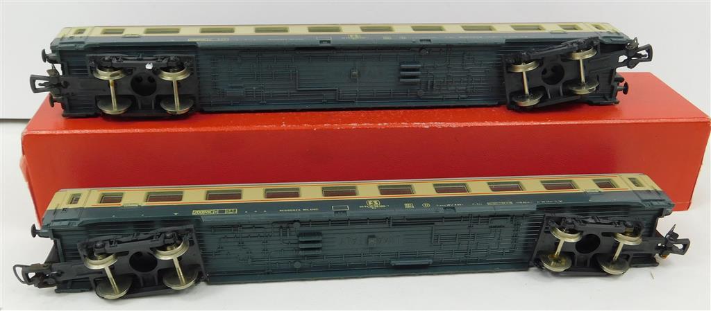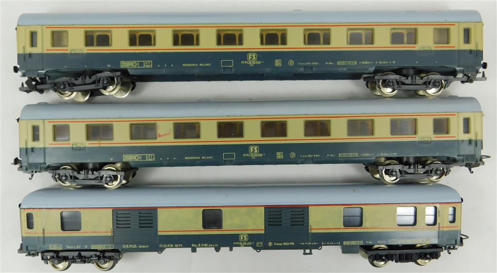 3 Lima Italian FS express coaches, in fair condition, missing some buffers, supplied in tatty original boxes