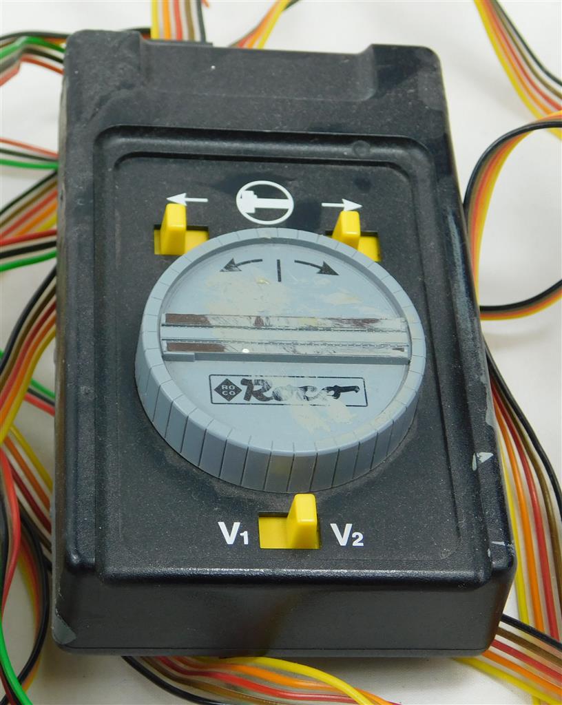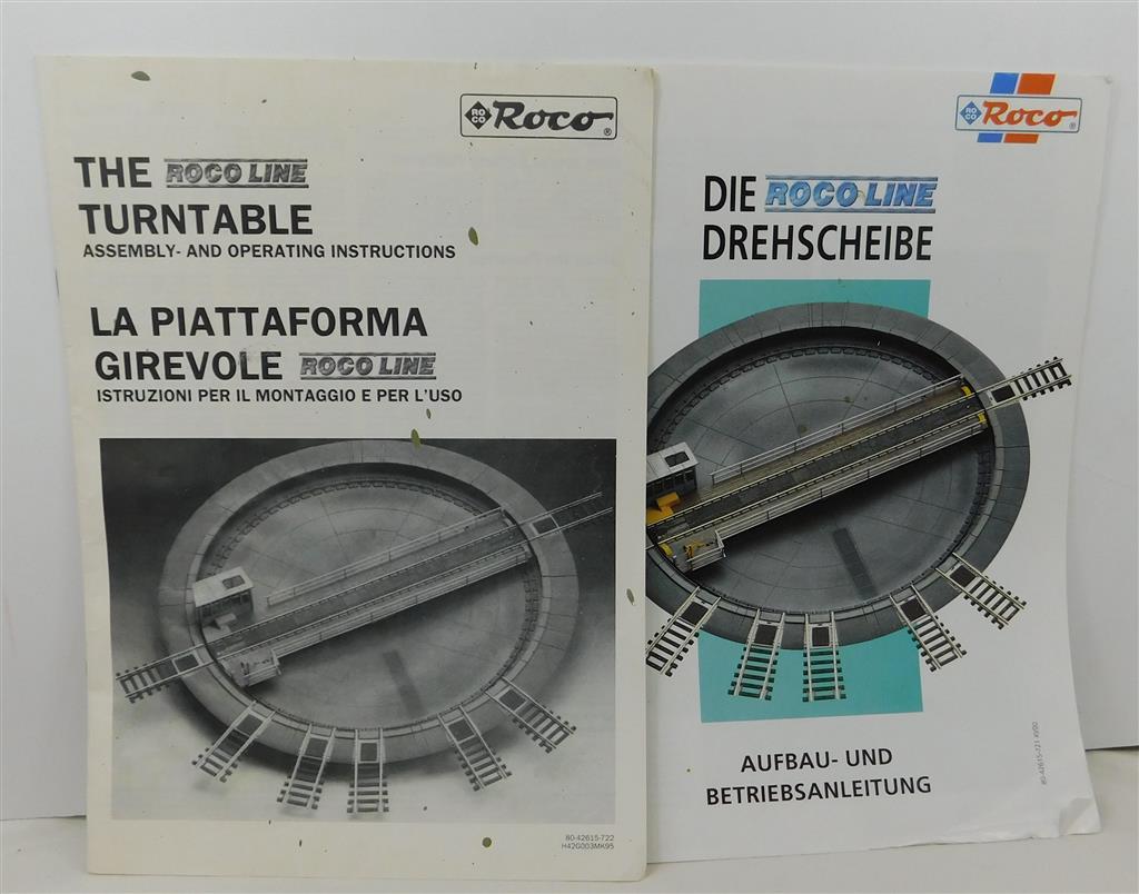 A complete Roco Line operating turntable, in working order, as removed from a layout, supplied in the tatty original box, with an assortment of extra connectors and instructions, note this is code 83 (2.1mm) high rail and will not connect to Peco or Hornby track. Ensure the DC/AC switch on the back of the control unit is set to DC otherwise it will not work properly