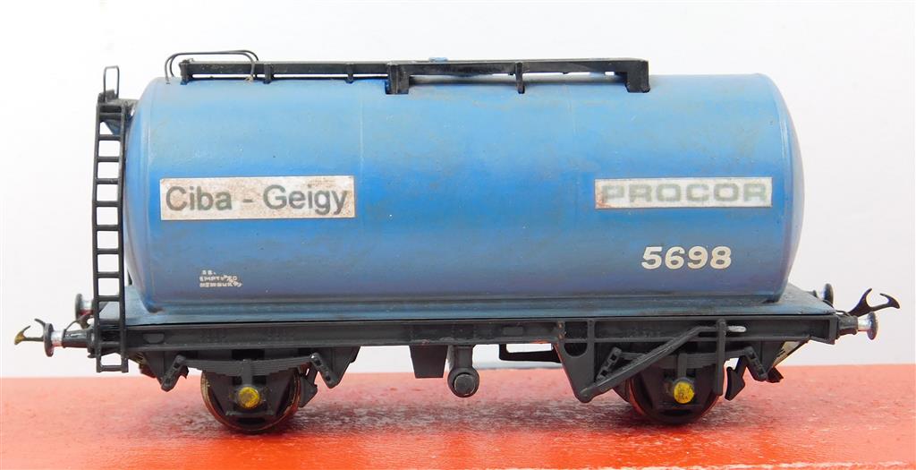 EM and P4 Gauge: Hornby repainted CIBA-GEIGY monobloc tank wagon with EM gauge and Spratt & Winkle couplings