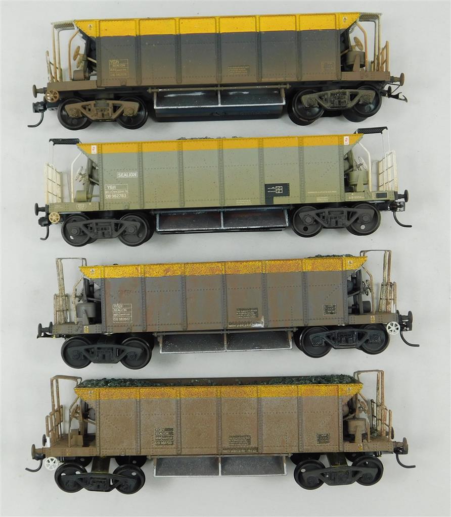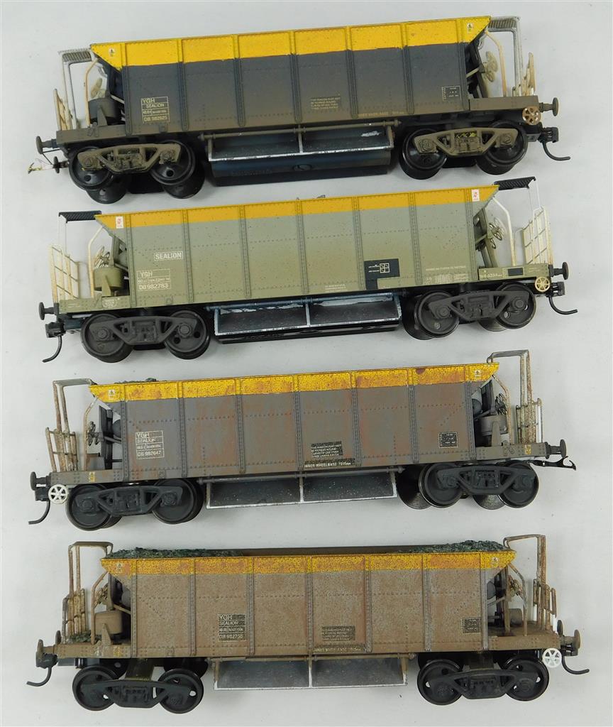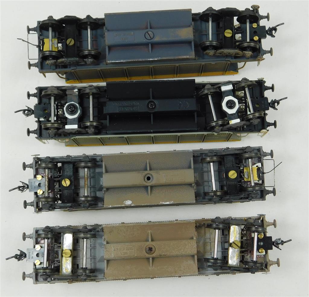 4 assorted Lima/Hornby Sealion hopper wagons with various couplings and EM gauge wheels, changed bogies, various modifications, no original boxes. You can change the wheels for 00 gauge wheels if needed.