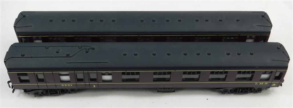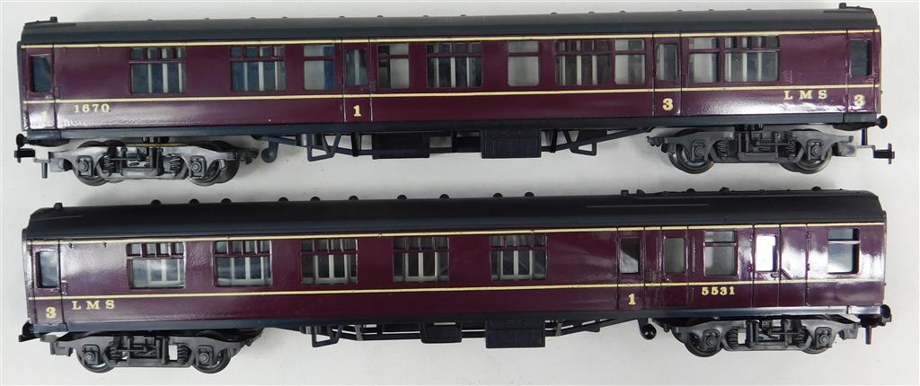 2 Liliput ex Trix plastic bodied "LMS" Mark 1 coaches with metal wheels and plastic couplings, in very good condition, please note these are 3.8mm/ft scale not 4mm/ft scale so slightly smaller, no original box.