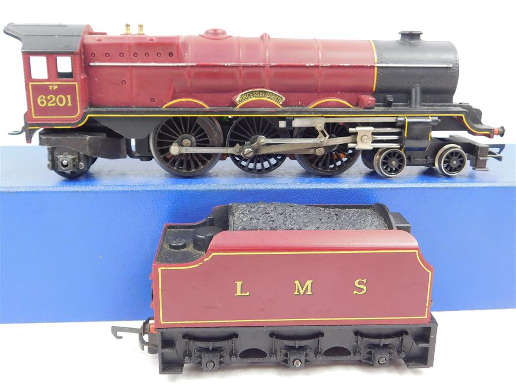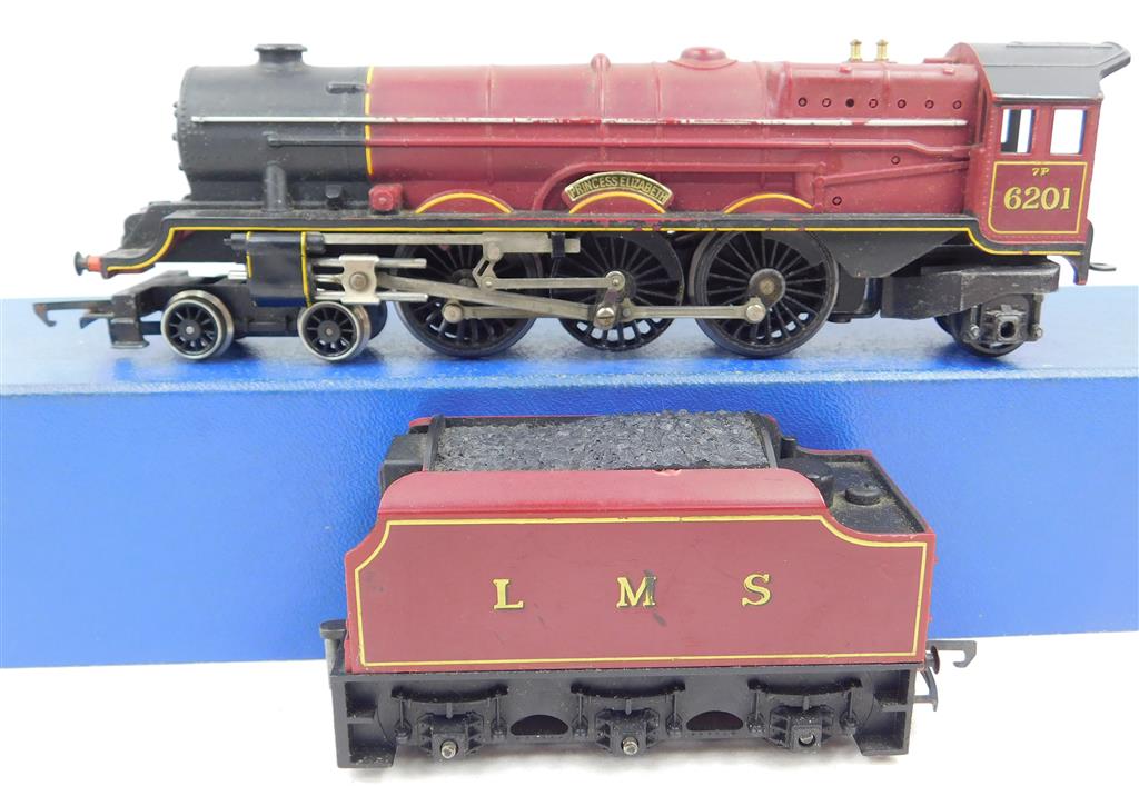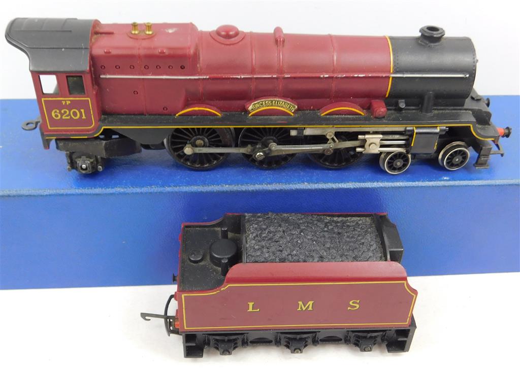 A Hornby 1970s production LMS Princess Elizabeth, noisy runner, needs a thorough electrical clean and lubrication, in good used cosmetic condition, no original box. Please note this chassis needs a controller capable of delivering at least 600mA to run well, and doesn't like new Hornby or Peco points as it has deep flanged wheels.