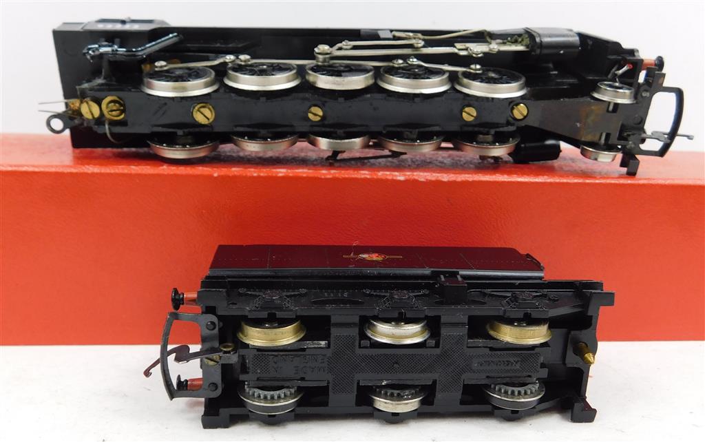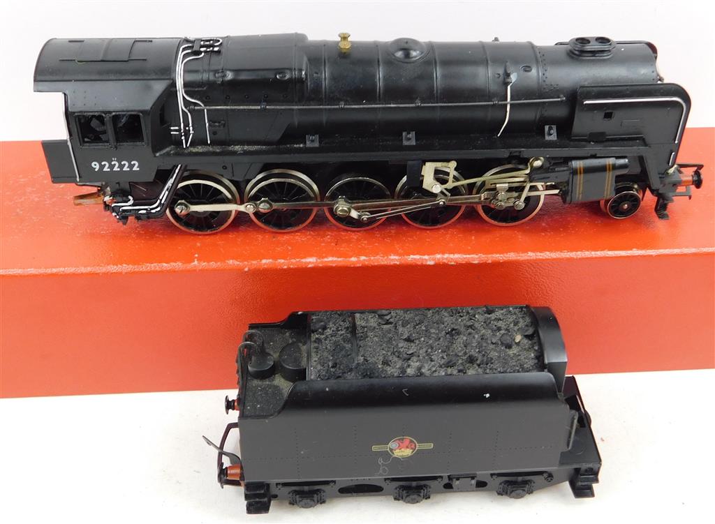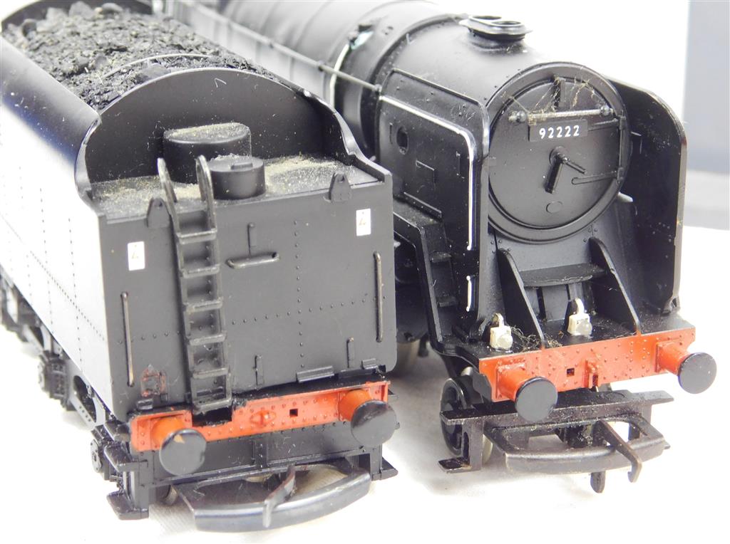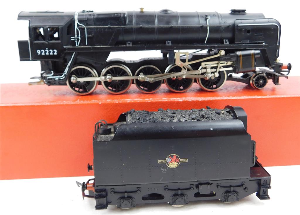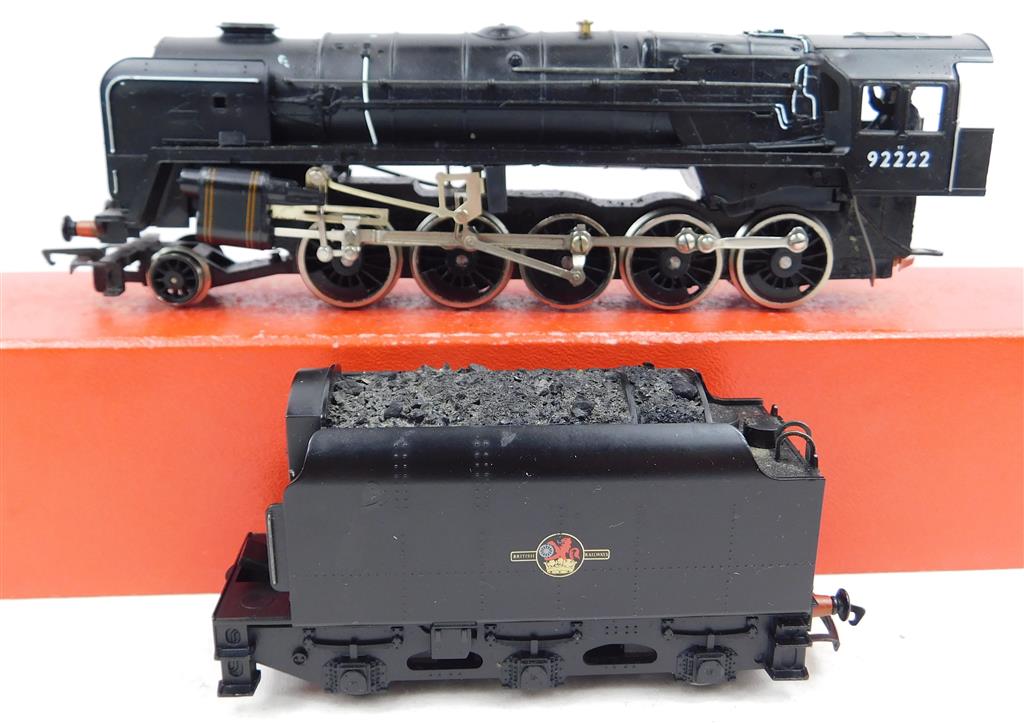 A Hornby tender drive 9F 92222 with added LED headlights which light when it is going backwards, runs in the wrong direction, needs re-wiring, a thorough electrical clean and lubrication, in fair condition, no original box