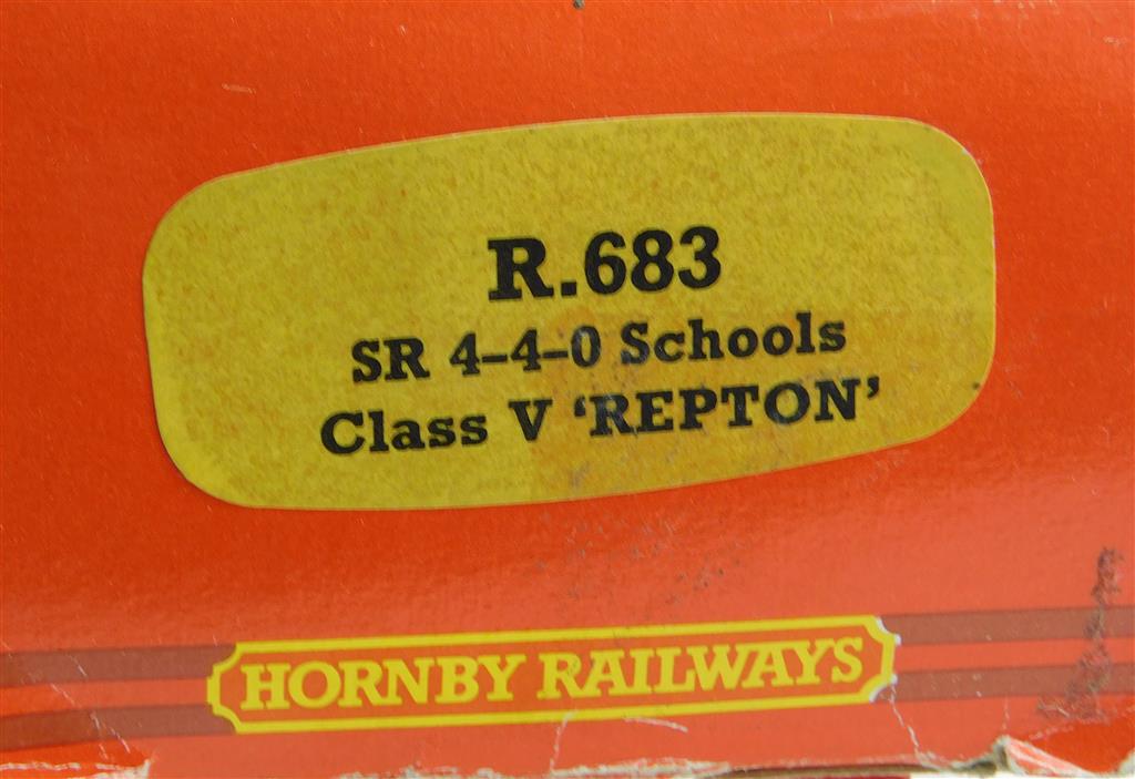 A Hornby R683 Schools loco "Repton", tender drive mechanism works well but the wheels in the loco have been removed and insert the wrong way round, so the loco doesn't work on the track, needs the loco dismantling and rebuilding, in good cosmetic condition, supplied in the original box