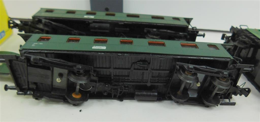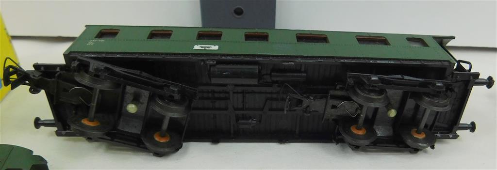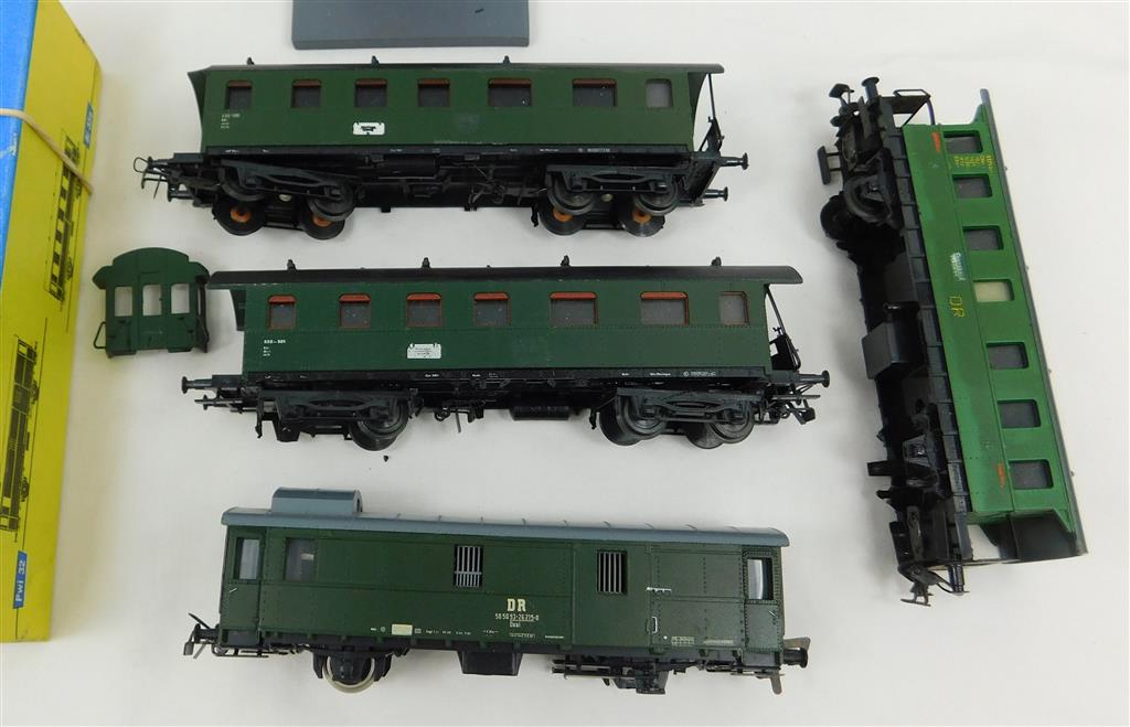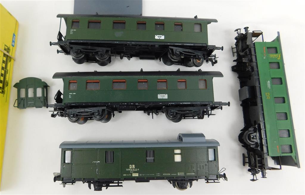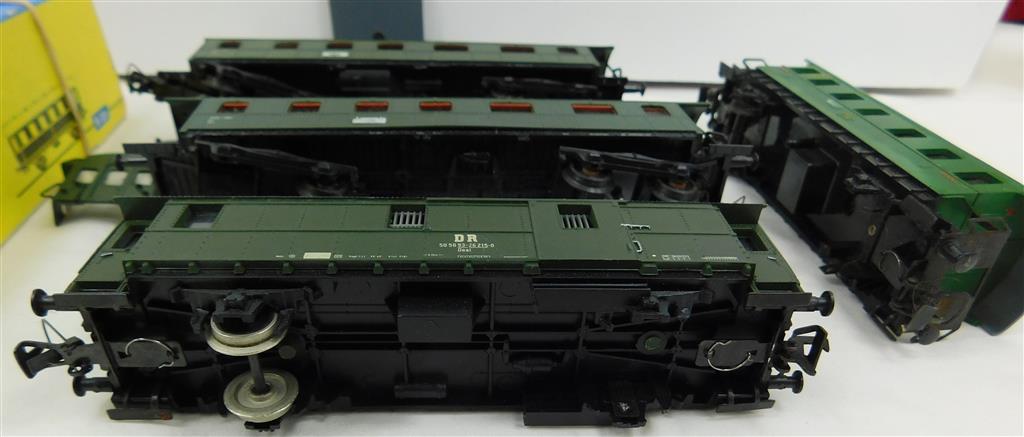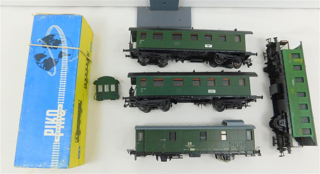 4 assorted Piko East German 4 wheel/short bogie coaches with mixed couplings, incomplete, missing some buffers, couplings, wheels, handrails, etc, supplied in incorrect original boxes.