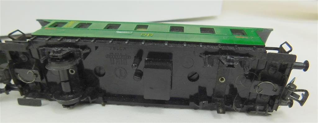European H0 Coaches: 4 assorted Piko East German 4 wheel/short bogie coaches with mixed couplings, incomplete, for spares/repair