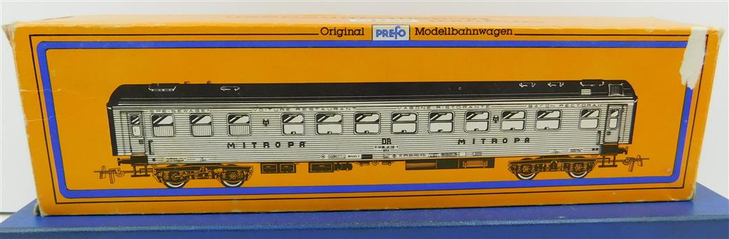 A Prefo East German Mitropa sleeping car, considerable paint loss so for spares/repair, supplied in the original box