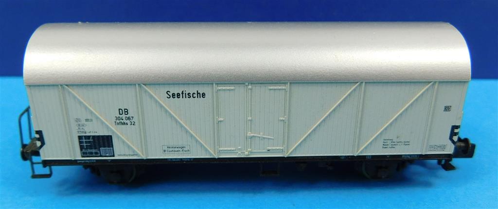 An Arnold N gauge German DB fish van, missing coupling one end and stiff coupling mechanism otherwise in good condition, no original box