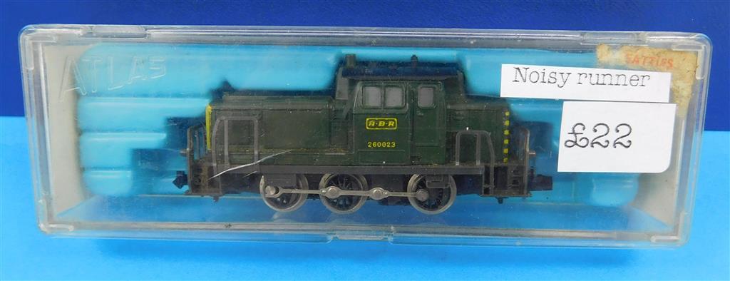 Rivarossi for Atlas N gauge 2195 Belgian ABR class diesel shunter, noisy runner, needs a thorough electrical clean and lubrication, in good condition, supplied in the original box