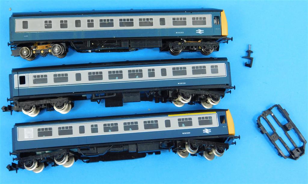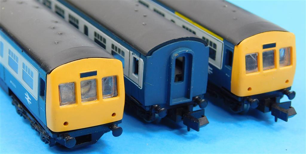 A Graham Farish N gauge blue/grey class 101, motor removed, missing/loose couplings, one bogie incorrect way round, one bogie case damaged, in fair cosmetic condition, supplied in the original box