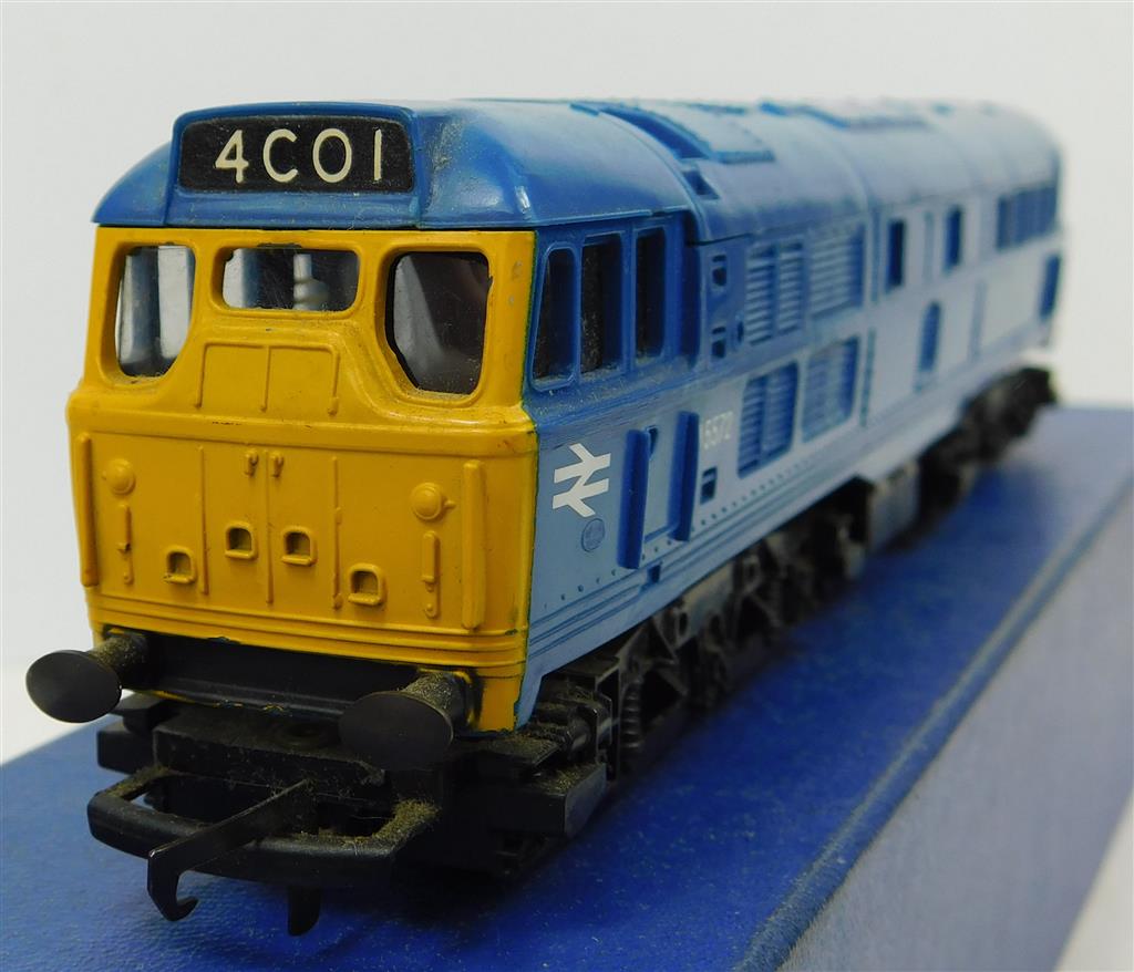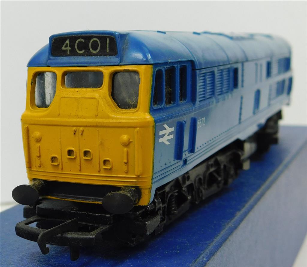 A late 1960s production Tri-ang Hornby blue class 31 diesel loco number D5572, bright electric blue, good runner, in good condition, no original box. Please note this loco needs a controller capable of delivering at least 600mA to run well, and doesn't like new Hornby or Peco points as it has deep flanged wheels.