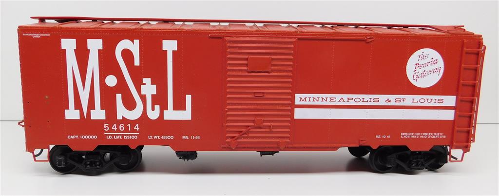 An American 0 scale M St L box car with Kadee couplings 54614, plastic bodied, fine scale wheels, missing handrails otherwise in good condition, no original packaging
