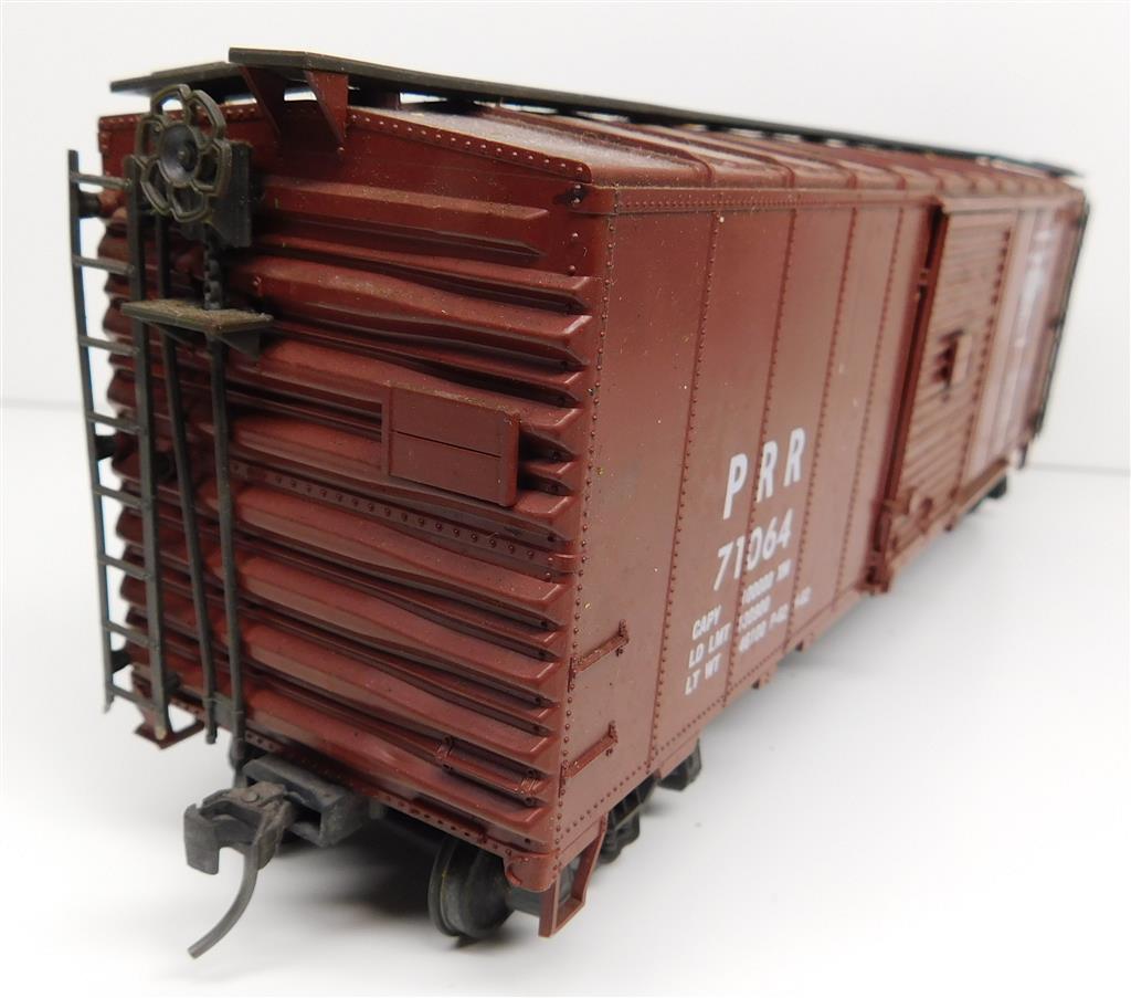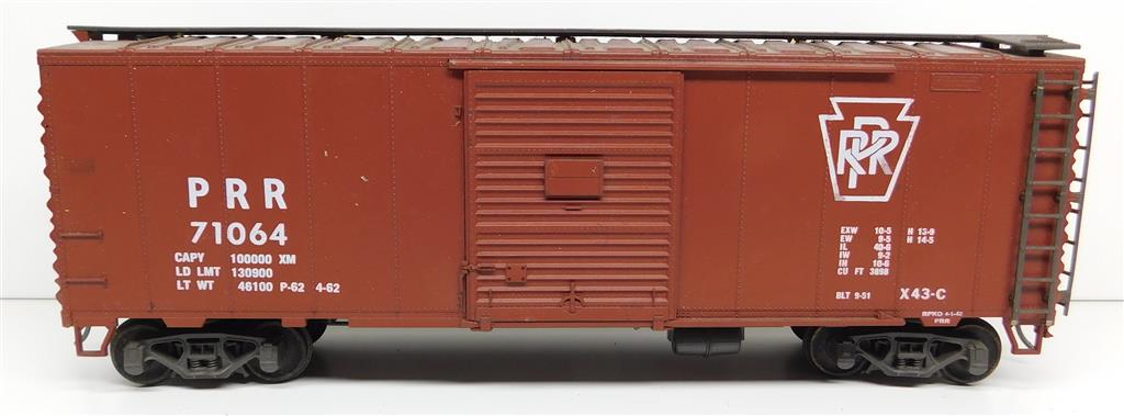An Atlas (made in Austria) American 0 scale Pennsylvania Railroad box car with Kadee couplings missing small springs to keep the couplings closed number PRR 71064, fine scale wheels, in good condition, no original packaging