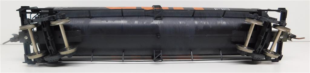 An American 0 scale 31cm long Gulf tank car with Kadee couplings number WRNX 14467, fine scale wheels, broken stay pipe and loose bogie mount one end otherwise in good condition, no original packaging