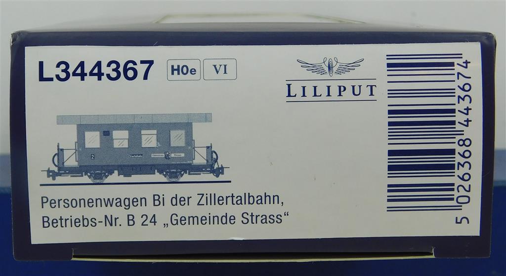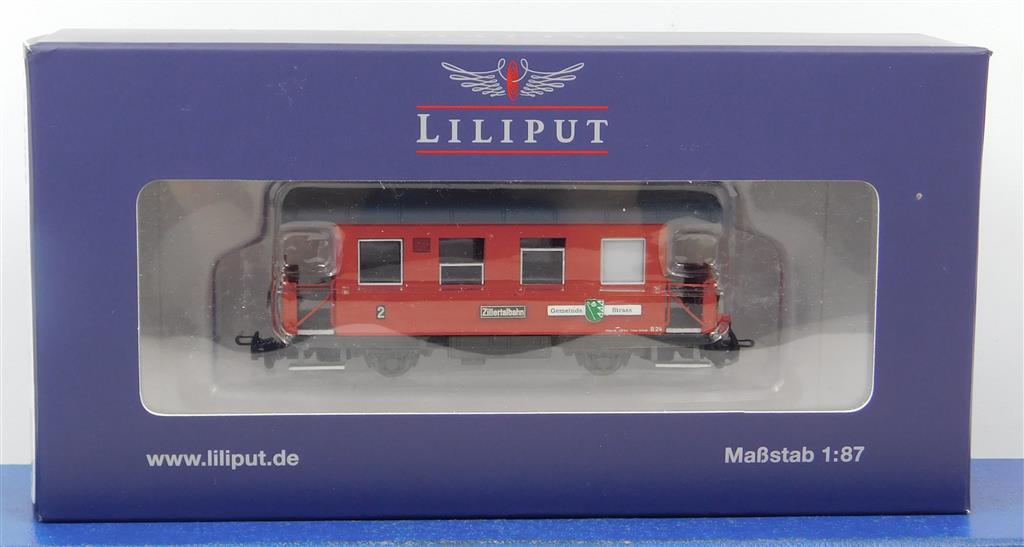 A Liliput L344367 H0e Zillertalbahn in Austria 4 wheel coach type B number 24 "Gemeinde Strass", new tooling not the original 1970s Liliput model upgraded, reddish-brown, in very good condition, supplied in the original box