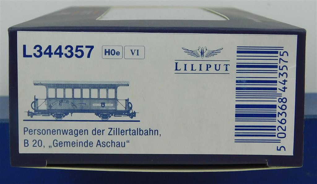 A Liliput L344357 H0e Zillertalbahn in Austria 4 wheel coach type B number 20 "Gemeinde Aschau", Kinderwagen, new tooling not the original 1970s Liliput model upgraded, reddish-brown, in very good condition, supplied in the original box