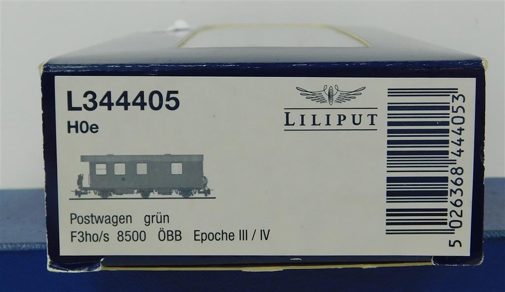A Liliput L344405 H0e OBB Austria 6 wheel Post coach type F3ho/s number 8500, in very good condition, supplied in the original box