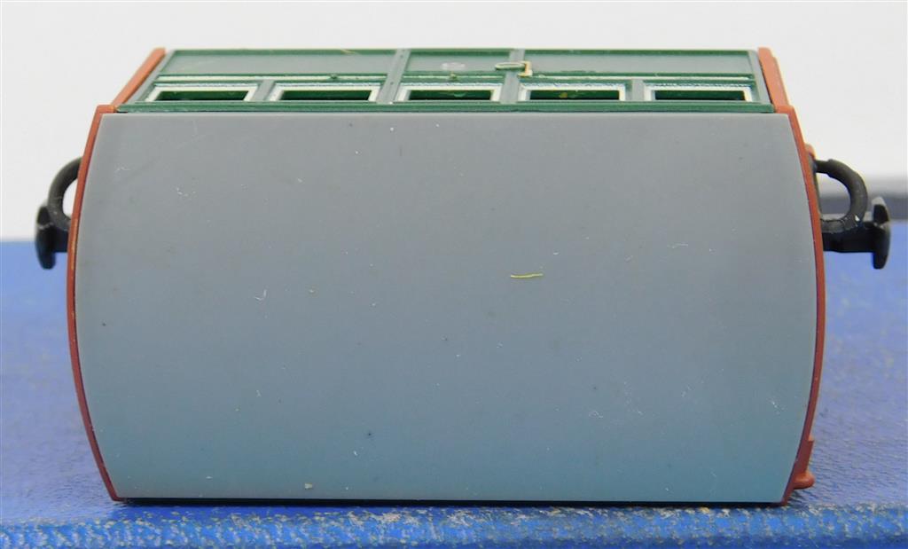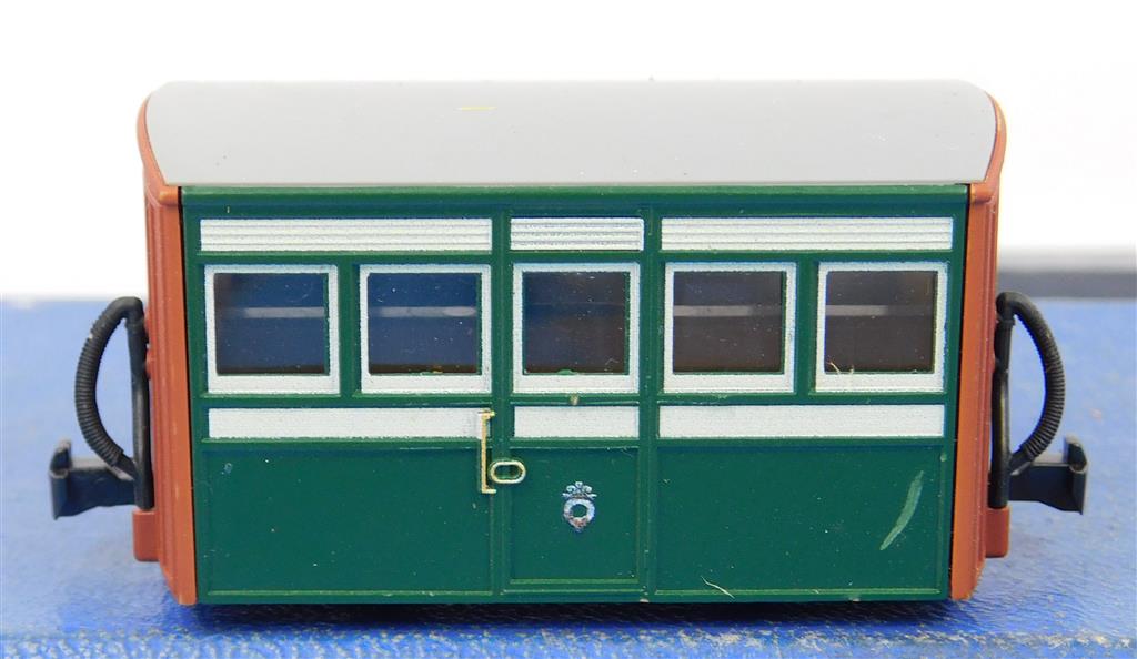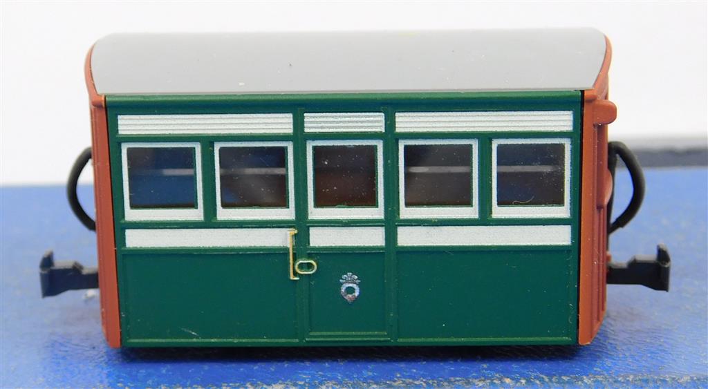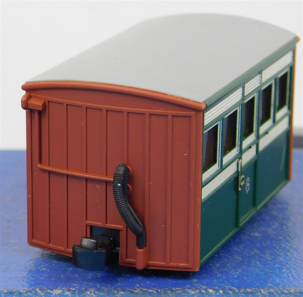 009 Narrow Gauge: Peco Ffestining Railway 4 wheel bug box coach, green, unnumbered, missing coupling loops
