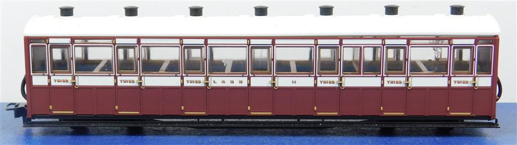 A Peco Lynton & Barnstaple (L&B) Railway 3rd class coach number 14, missing plug-in coupling one end otherwise in good condition, no original box