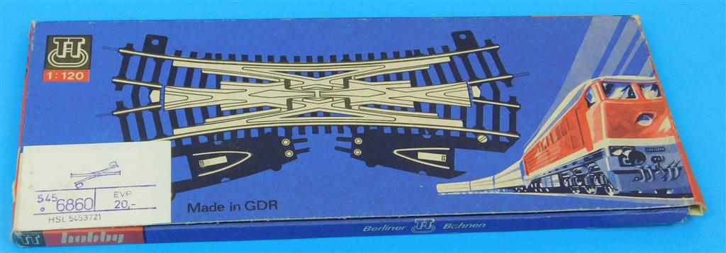 A BTTB TT 6860 Double Slip DKW with two solenoids, both work but the mechanism needs a clean and possibly lubrication to work properly, slightly rusty track, supplied in the original box.
