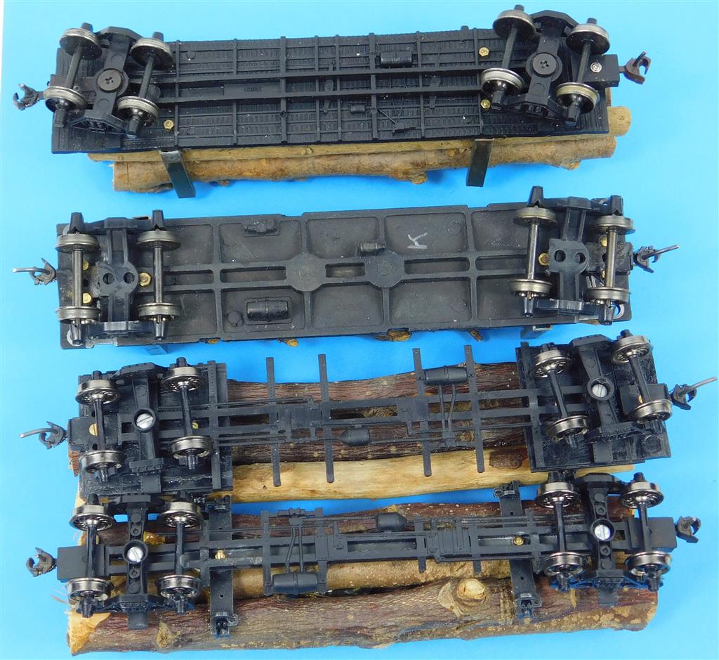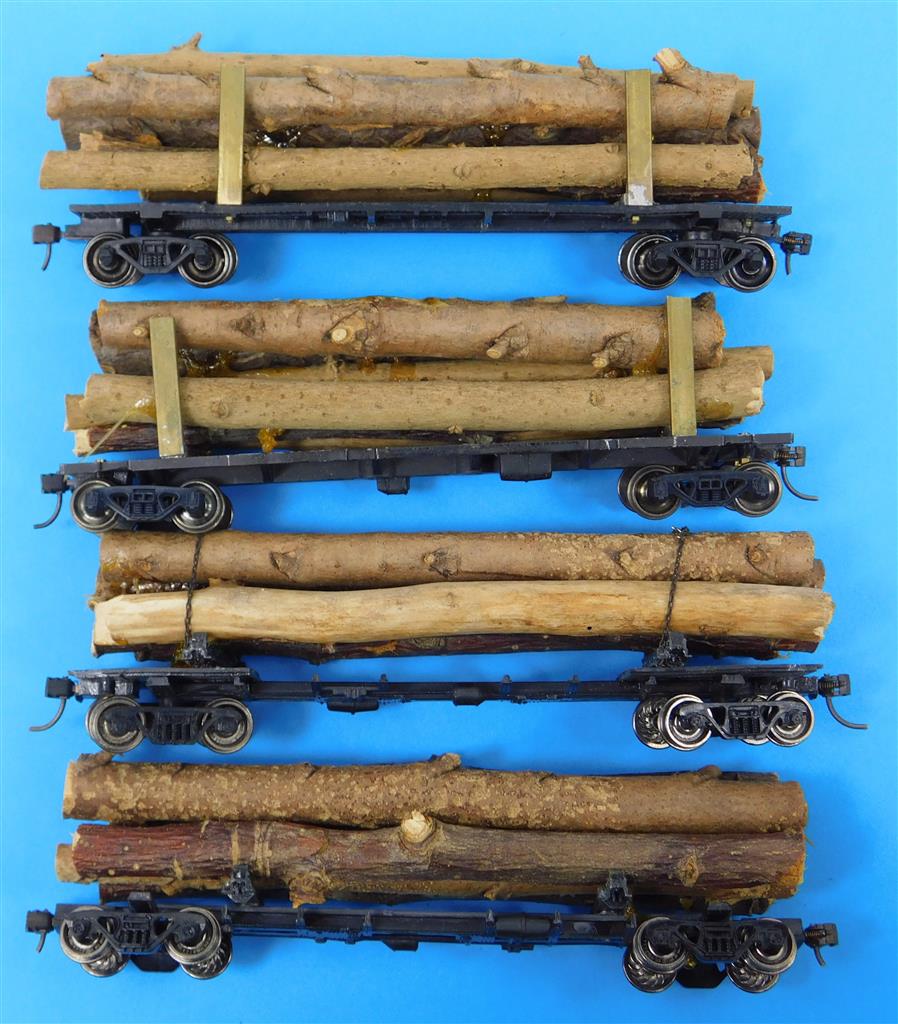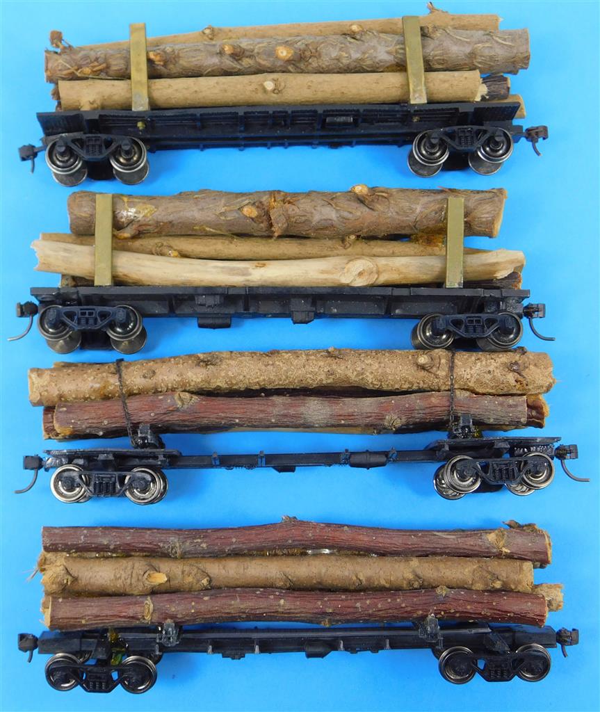 4 home made log cars with Kadee type couplings, in fair condition, no original boxes.