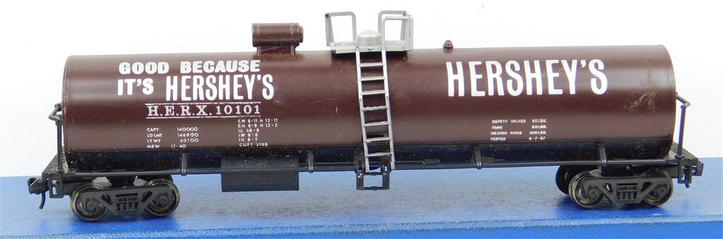 Mehano Hershey tank car with Kadee type couplings, missing one coupling spring and some handrails, metal wheels, in fair condition, no original box.