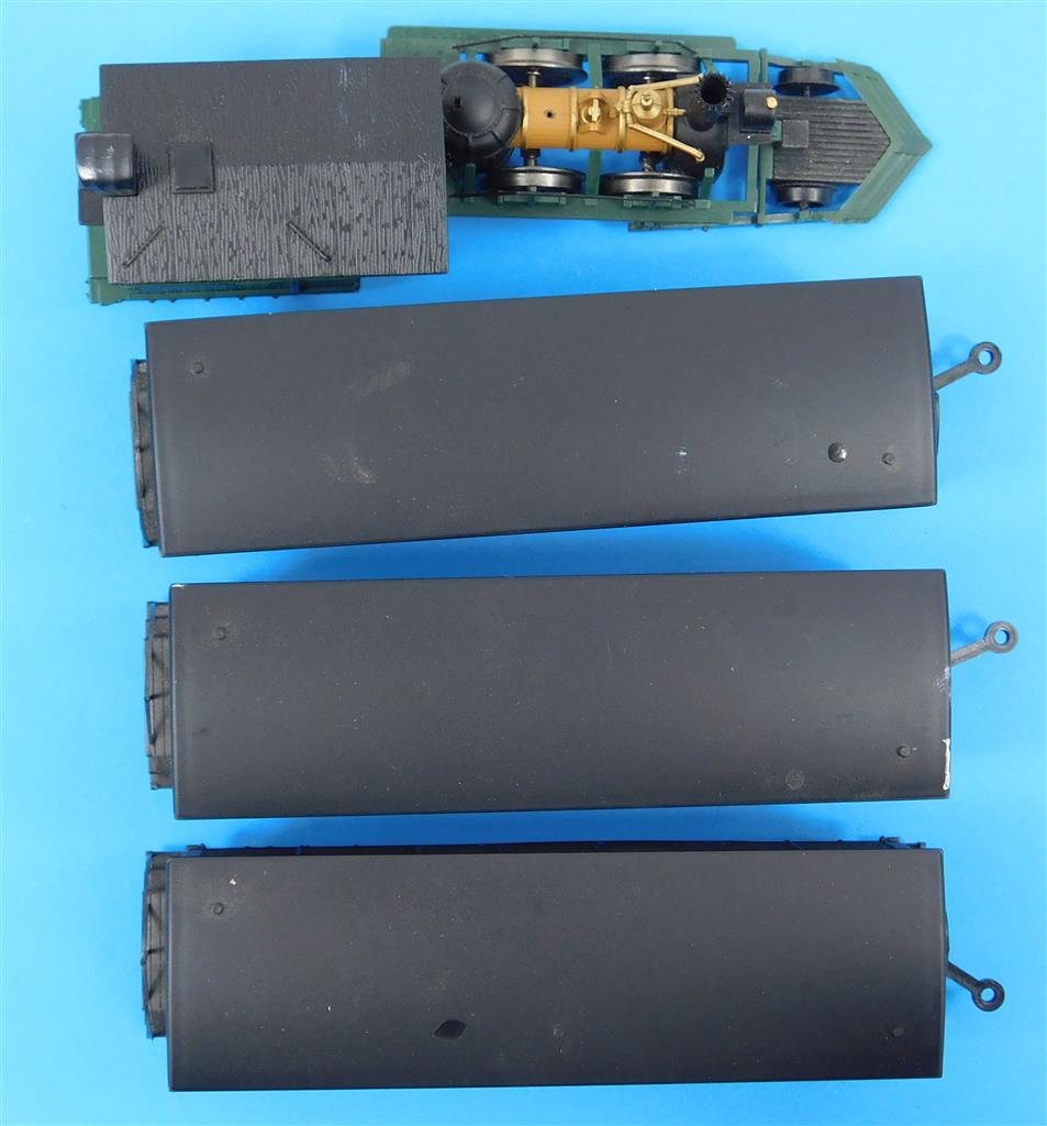 A Bachmann H0 scale John Bull 2-4-0 loco and 3 coaches, good runner (but it is a primitive mechanism so not as controllable as better engineered models), missing some handrails and some boiler details otherwise in good used condition, no original box
