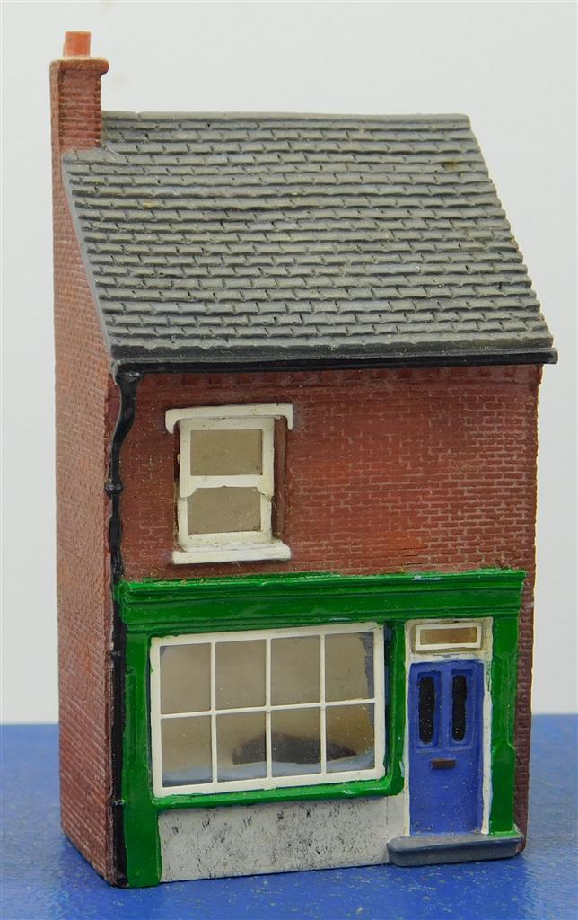 A Hornby N gauge Lyddle End half-relief terraced green shop, in good used condition, no original box