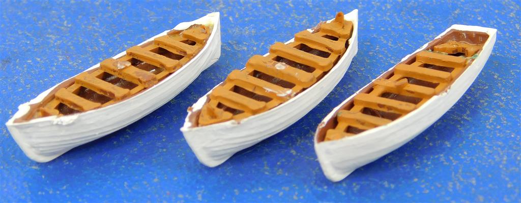 An N gauge trio of small boats, make unknown, as removed from a layout, in fair used condition
