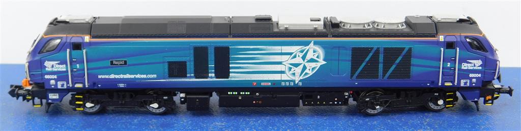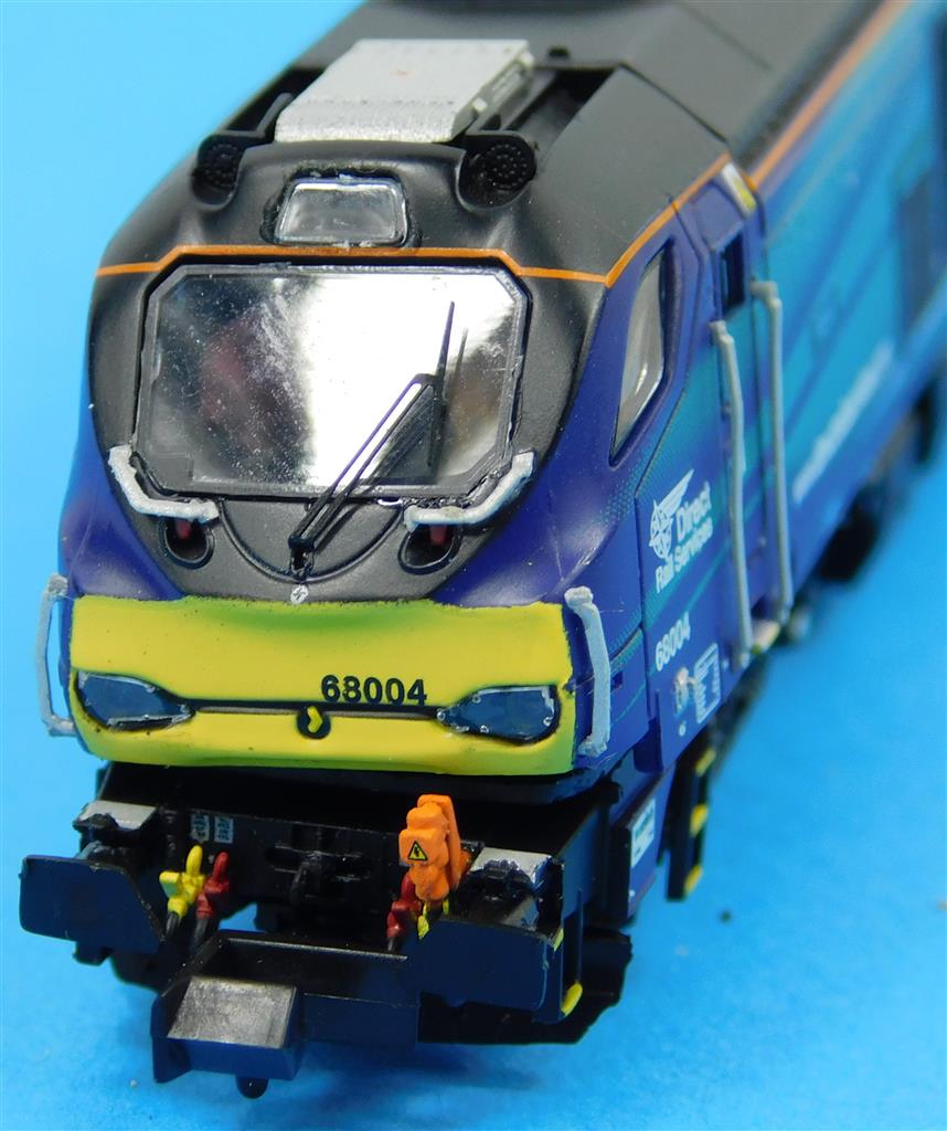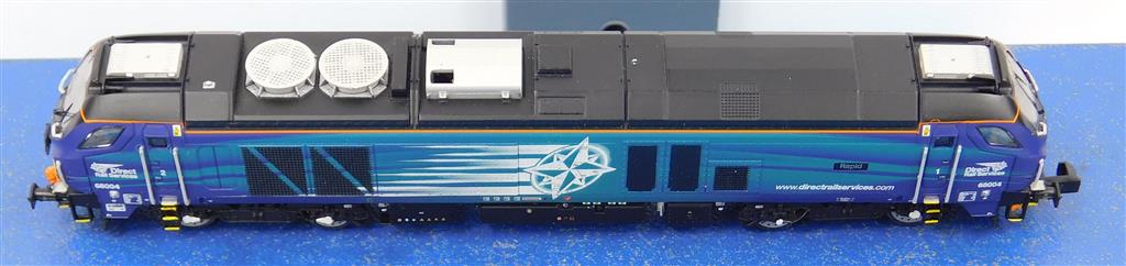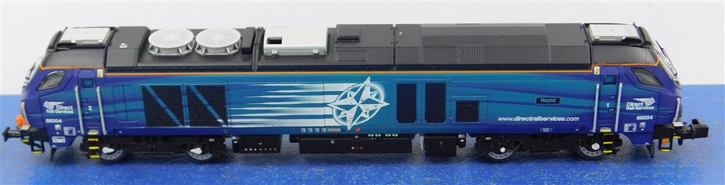 A Dapol N gauge DRS class 68 number 68004, good slow runner with directional head and tail lights, body doesn't sit right, no original box