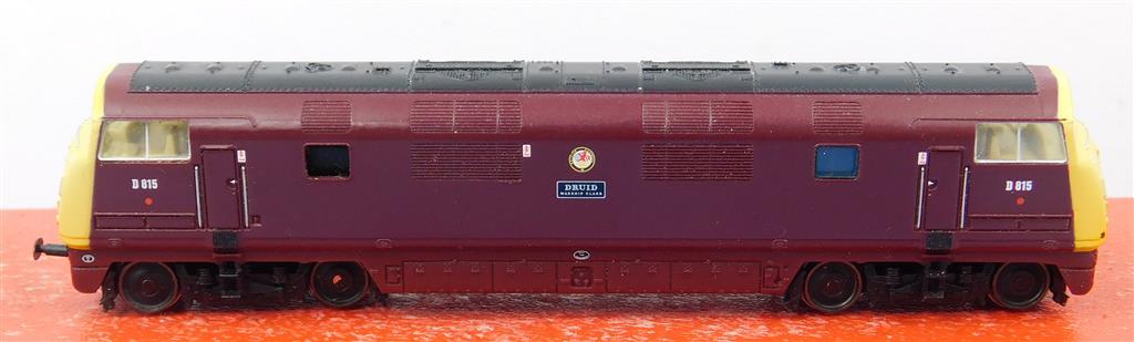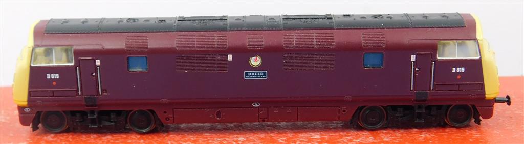 A Graham Farish 371-603 N gauge Warship D815 Druid, DCC fitted, very reluctant runner, needs a thorough electrical clean, missing buffers one end, in good cosmetic condition but needs a clean, supplied in an original box