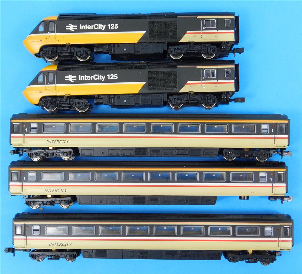 A Dapol N gauge InterCity HST, DCC fitted, power car is a good runner on DCC (#10) and DC, directional head and tail light, coaches need attention as they are missing bogies, wheels and have damaged couplings, supplied in the original box, sold as a project or a source of parts.