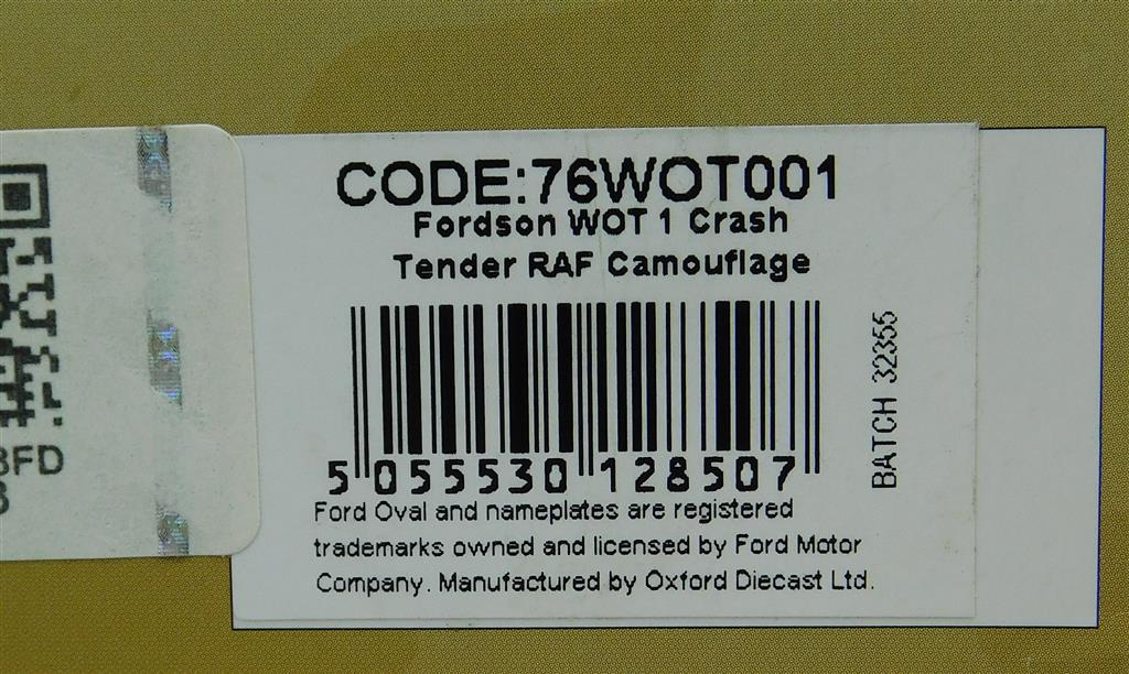 An Oxford 76WOT001 Fordson WOT1 Crash Tender RAF Camouflage, in good condition, supplied in the original box missing one mounting screw.